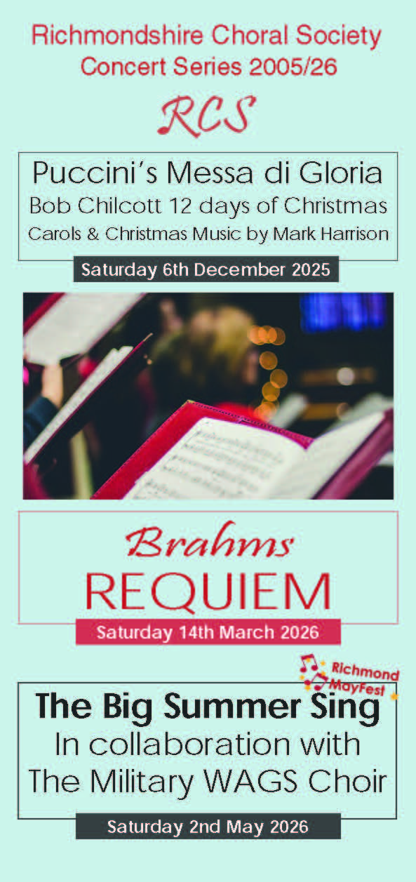 Our first concert of the 2025-26 season is on Saturday 6th December. We will be bringing glorious tunes and Italiante spirit to Richmond by singing Puccini's Messa Di Gloria. The rest of the concert is a celebration of the season with Christmas works by Bob Chilcott and Mark Harrison and some traditional congregational carols.